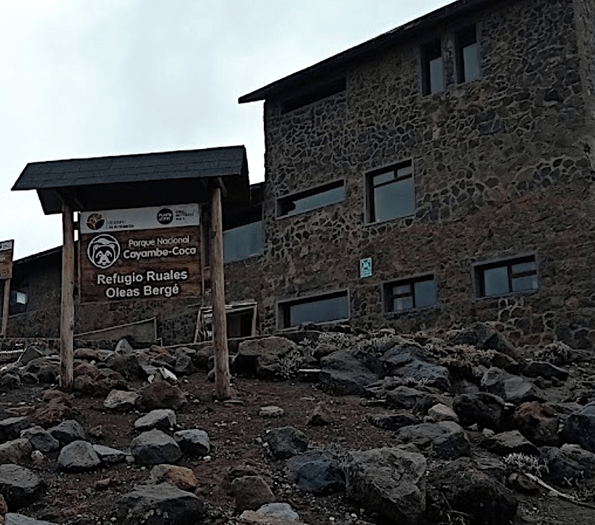 El Refugio Ruales Oleas Berge se encuentra a 4.600 m / 15.092 ft. Cuenta con dormitorios compartidos, comedor, cocina y baños básicos. Es el punto de partida estándar para el ascenso al Cayambe.